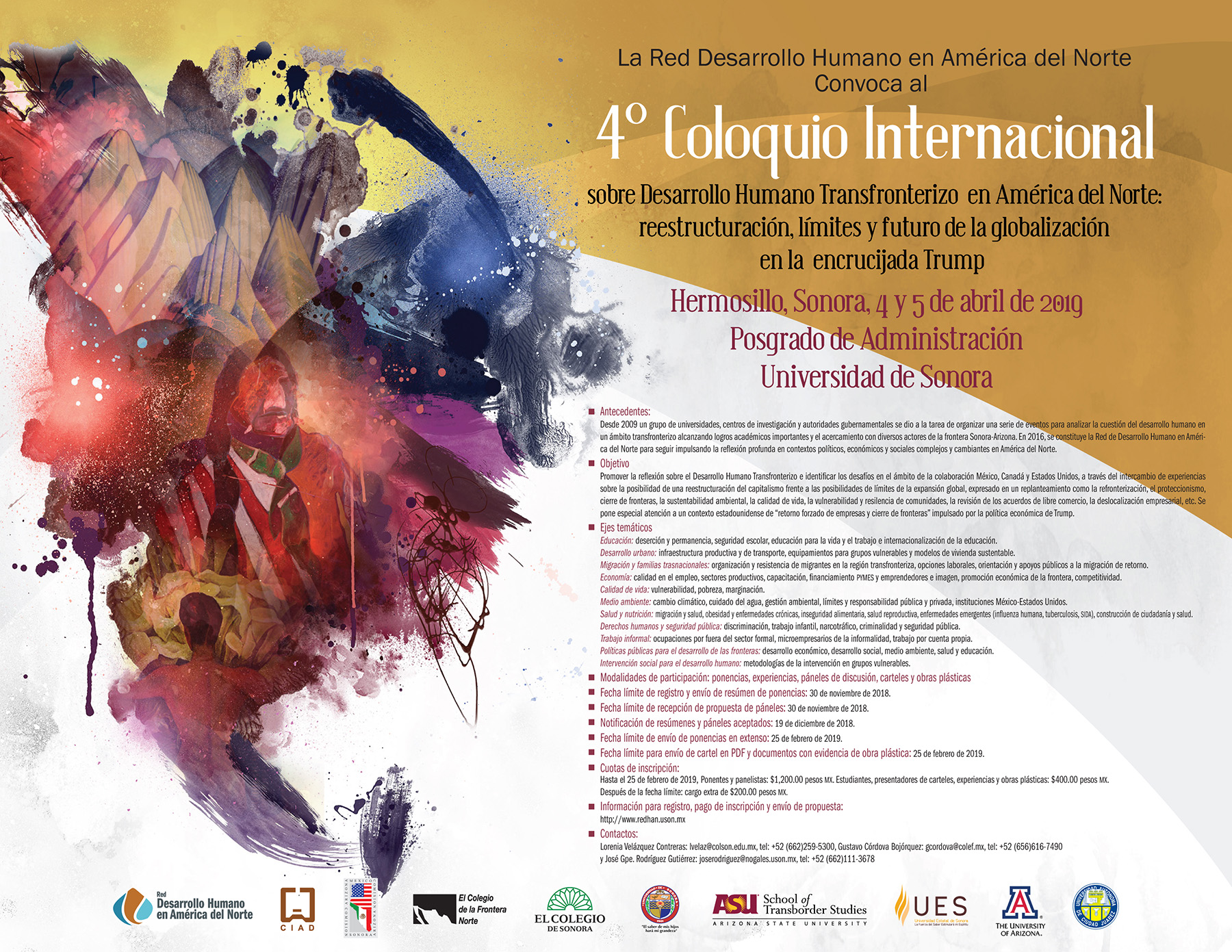 La Red de Desarrollo Humano en América del Norte convocan al Cuarto Coloquio Internacional, sobre desarrollo Humano Transfrinterizo en América del Norte: reestructuración, límites y futuro de globalización en la encrucijada Trump