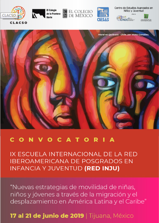 La Red de Posgrados del Consejo Latinoamericano de Ciencias Sociales (CLACSO), la Red Iberoamericana de Posgrados en Infancias y Juventudes (Red INJU), El Colegio de la Frontera Norte (El Colef), El Colegio de México (COLMEX), el Centro de Investigaciones y Estudios Superiores en Antropología Social (CIESAS) y el Centro de Estudios Avanzados en Niñez y Juventud de la alianza CINDE-Universidad de Manizales (CEANJ), convocan a estudiantes avanzados de maestría y doctorado, responsables de políticas públicas y referentes de organizaciones sociales de América Latina y el Caribe, a presentar sus postulaciones para participar en la IX Escuela Internacional de Posgrado “Nuevas estrategias de movilidad de niñas, niños y jóvenes a través de la migración y el desplazamiento en América Latina y el Caribe”, a llevarse a cabo en la ciudad de Tijuana, Baja California, México del 17 al 21 de junio de 2019.