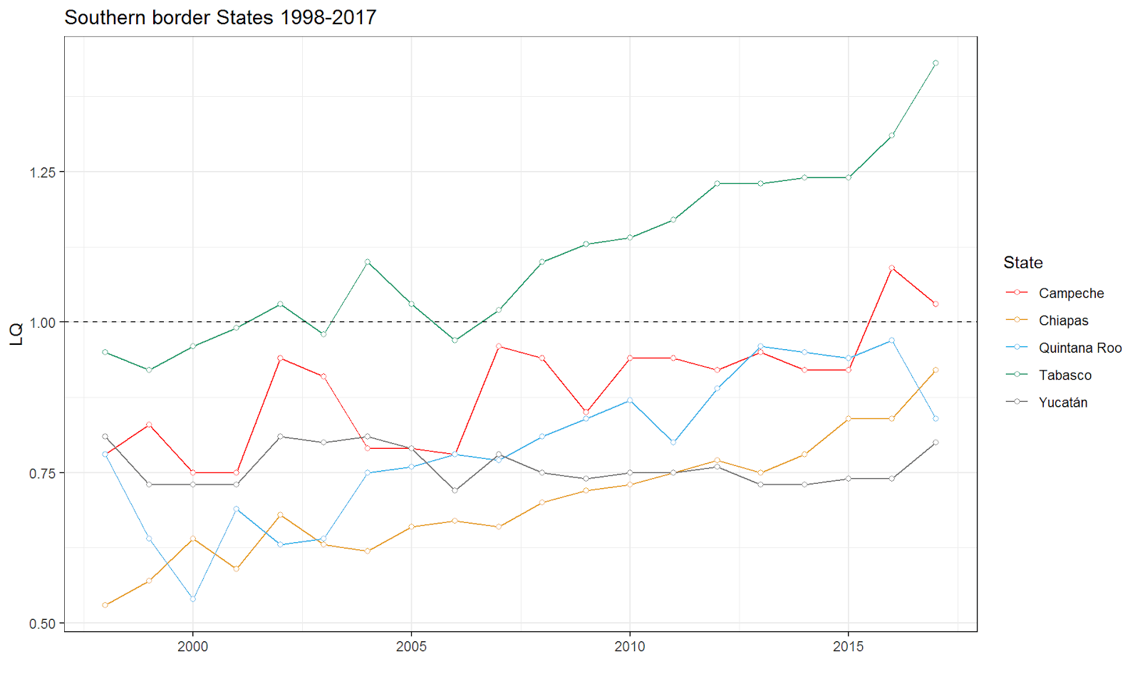 A medida que avanza el tiempo, la frontera sur ha ido incrementado su tasa de mortalidad de forma acelerada. A inicios de la década los 90´s esta región mantenía niveles bajos pero la trayectoria se modificó; y la brecha entre niveles generales de mortalidad y diabetes aumentó. Por ejemplo, en Quintana Roo la muerte por diabetes tuvo un incremento de 169% en comparación con otras causas de muerte. De igual manera, Chiapas muestra una brecha equivalente al 109.8%. En contraste, Sonora, con la brecha más pequeña entre mortalidad general y mortalidad por diabetes se encuentra por debajo del 13%.