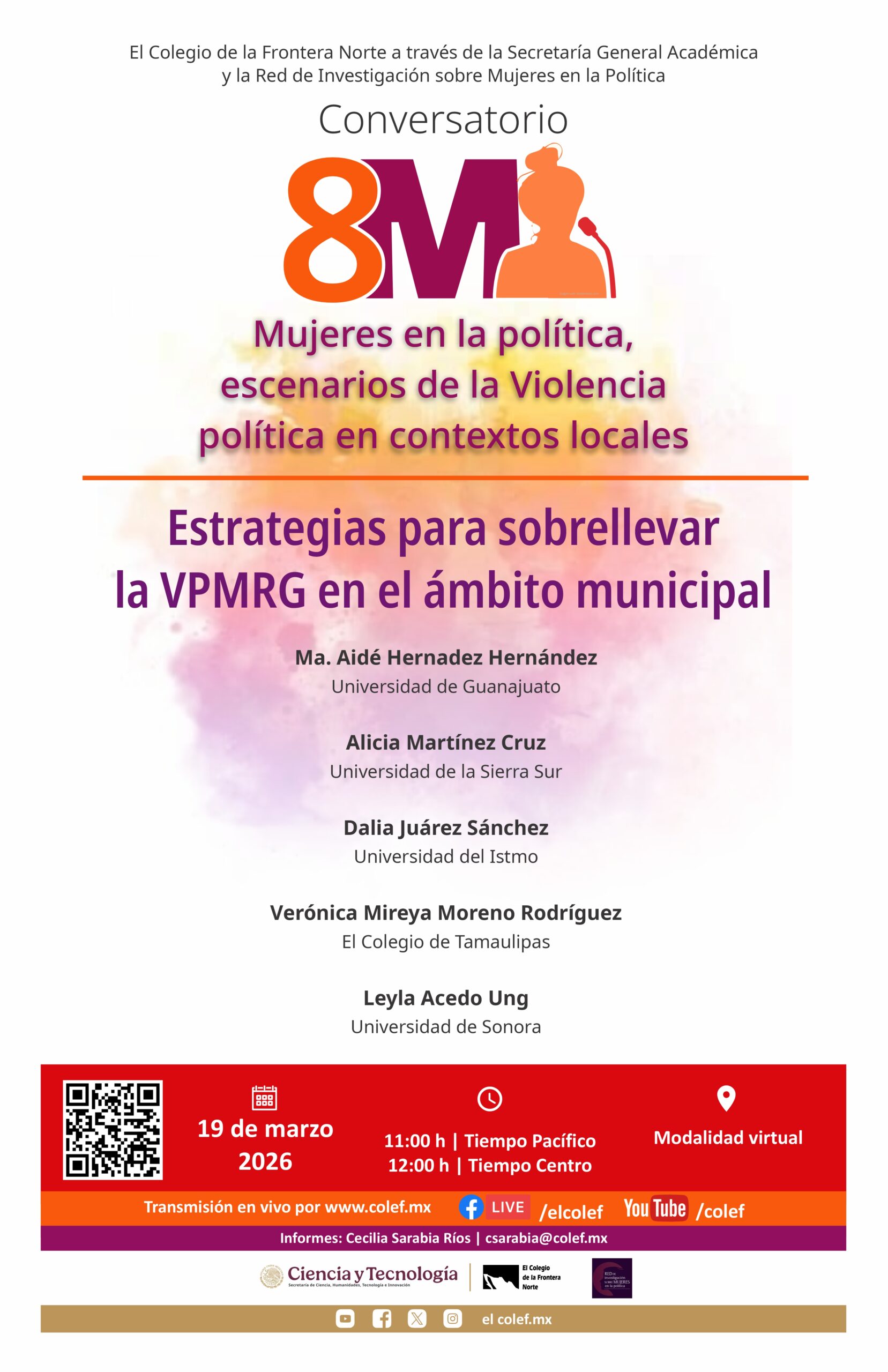 Por lo anterior, en el marco del Dia Internacional de la Mujer, El Colegio de la Frontera Norte y la Red de Investigación sobre Mujeres en la Política organizan el Conversatorio 8M, “Mujeres en la política, escenarios de la Violencia Política en contextos locales”.