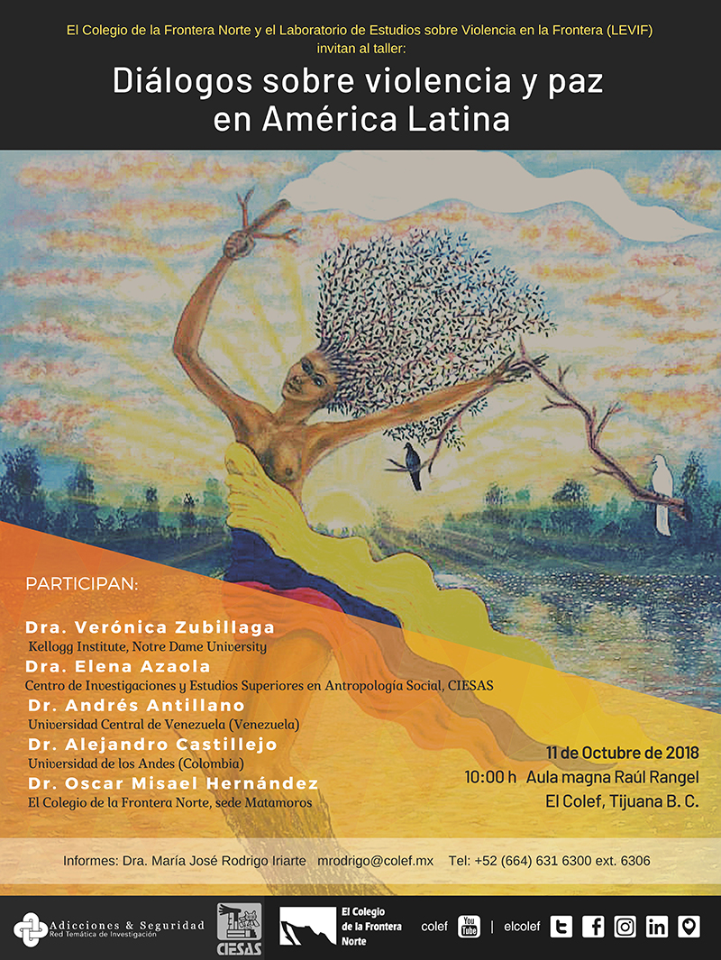 El Colegio de la Frontera Norte, el Laboratorio de Estudios sobre Violencia en la Frontera (LEVIF) y la Red Temática de Investigación Adicciones y Seguridad, invitan al taller: Diálogos sobre violencia y paz en América Latina el próximo jueves 11 de octubre a las 11:00 horas en el Aula magna Raúl Rangel de El Colef Sede Tijuana, con la participación de: