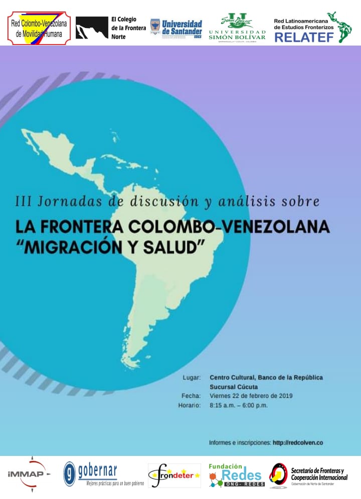 El próximo 21 y 22 de febrero se llevará a cabo la Tercer Jornada de discusión y análisis sobre la frontera Colombo-Venezolana ‘‘Migración y Salud’’, organizada por la Red Colombo-Venezolana de Movilidad Humana en colaboración con la Red Latinoamericana de Estudios Fronterizos RELATEF, El Colegio de la Frontera Norte (El Colef), la Universidad de Santander UDES Cúcuta y la Universidad Simón Bolívar Sede Cúcuta.