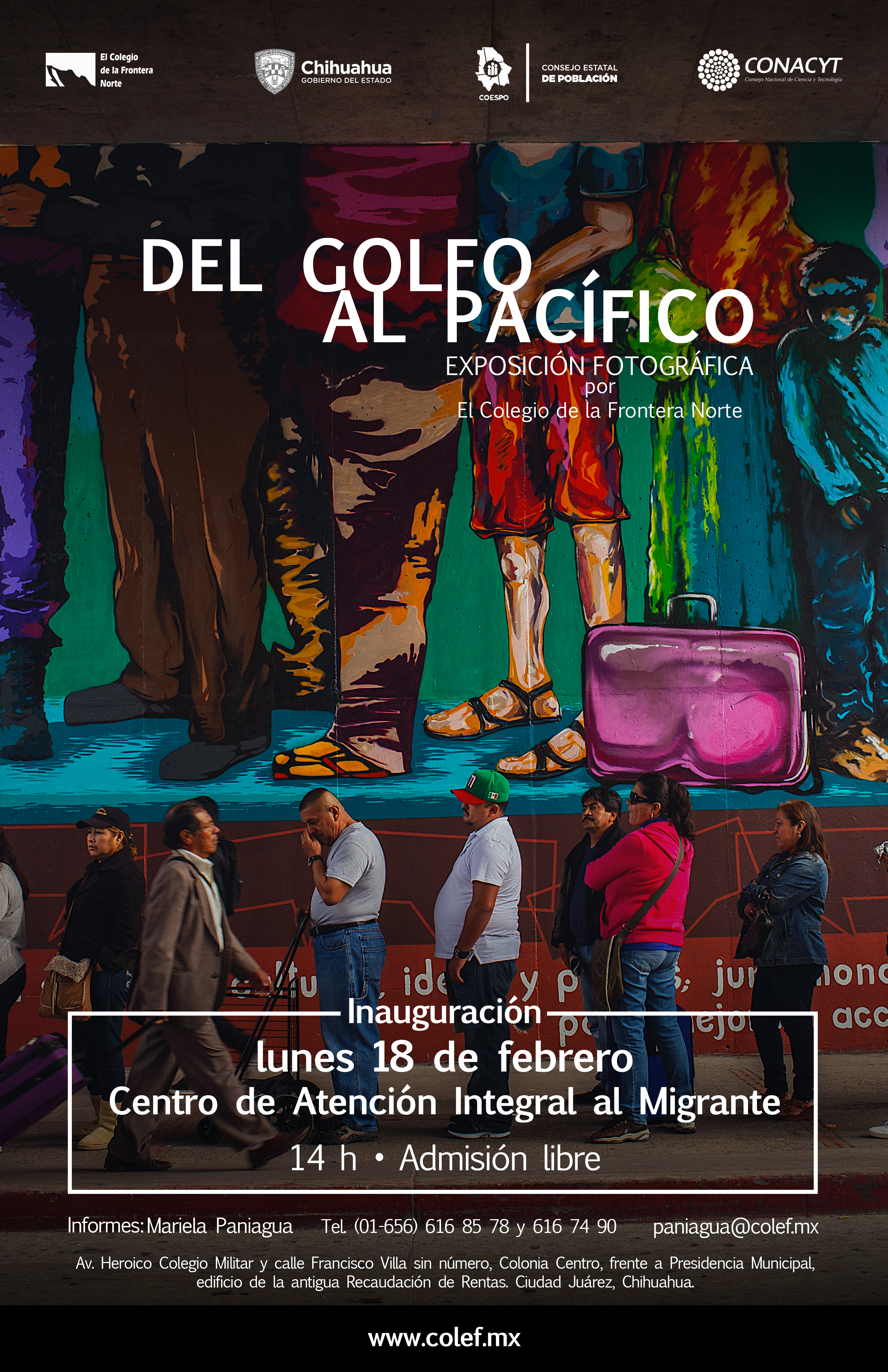 El Colegio de la Frontera Norte, le invita a la inauguración de la exposición Del Golfo al Pacífico en Ciudad Juárez el 18 de febrero, a las 14:00 horas en el Centro de Atención Integral al Migrante, ubicado en Av. Heroico Colegio Militar y calle Francisco Villa sin número, Colonia Centro, frente a Presidencia Municipal, edificio de la antigua Recaudación de Rentas. La admisión es libre.