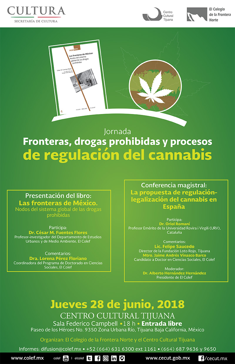 En el marco de este evento se llevará a cabo la presentación de un libro sobre tráfico y consumo de drogas en fronteras y una conferencia magistral sobre procesos de regulación del cannabis a partir de los casos de España y México.