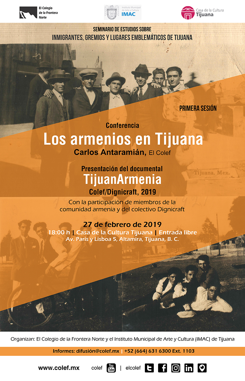 La primera sesión del Seminario de estudios sobre inmigrantes, gremios y lugares emblemáticos de Tijuana, se llevará a cabo el miércoles 27 de febrero a las 18:00 horas en el Teatro de la Casa de la Cultura de Tijuana, con la conferencia: Los armenios en Tijuana, presentada por el Dr. Carlos Antaramián de El Colef y la proyección del documental: TijuanArmenia, con la participación de miembros de la comunidad armenia y del colectivo Dignicraft.
