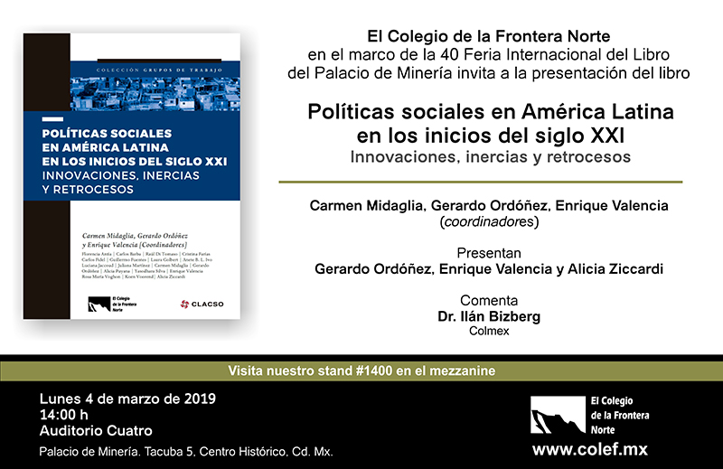 El Colef invita a la presentación del libro: Políticas sociales en América Latina en los inicios del siglo XXI. Innovaciones, inercias y retrocesos, en el marco de la 40° edición de la Feria Internacional del Libro del Palacio de Minería, que se llevará a cabo del 21 de febrero al 4 de marzo en el Palacio de Minería del Centro Histórico de la Ciudad de México, en donde El Colef contará con un stand de libros ubicado con el número 1400 del Mezzanine.