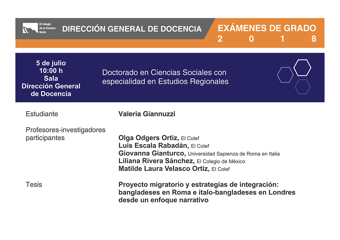 El Colegio de la Frontera Norte, a través de la Dirección General de Docencia se complace en invitar al examen de grado de la estudiante Valeria Giannuzzi del Doctorado en Ciencias Sociales con especialidad en Estudios Regionales, con la presentación de la tesis «Proyecto migratorio y estrategias de integración: bangladeses en Roma e ítalo-bangladeses en Londres desde un enfoque narrativo».