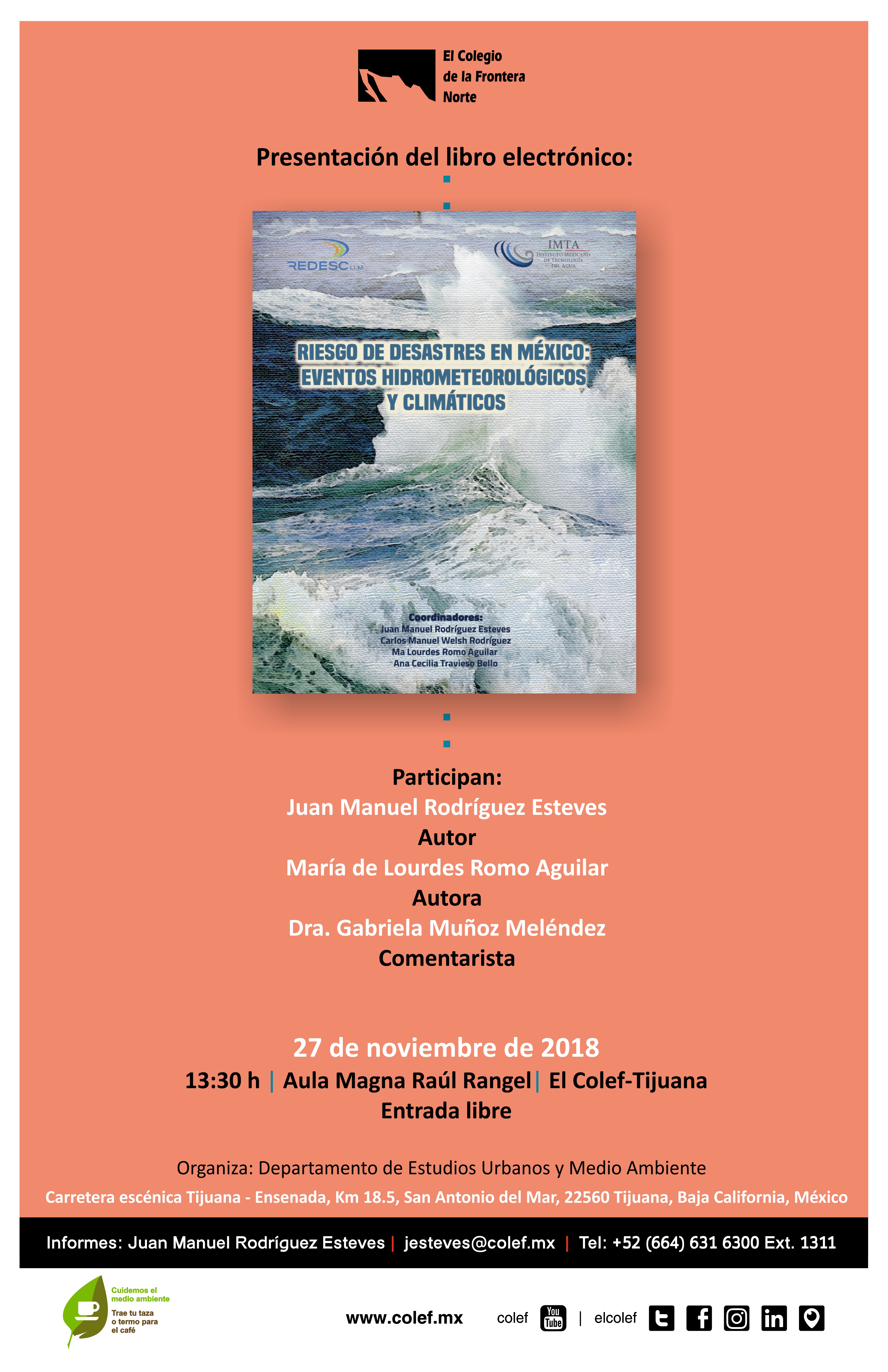 El Colegio de la Frontera Norte invita a la presentación del libro: Riesgo de desastres en México: eventos hidrometeorológicos y climáticos, el 27 de diciembre a las 13:30 h en el Aula magna Raúl Rangel de El Colef sede Tijuana.