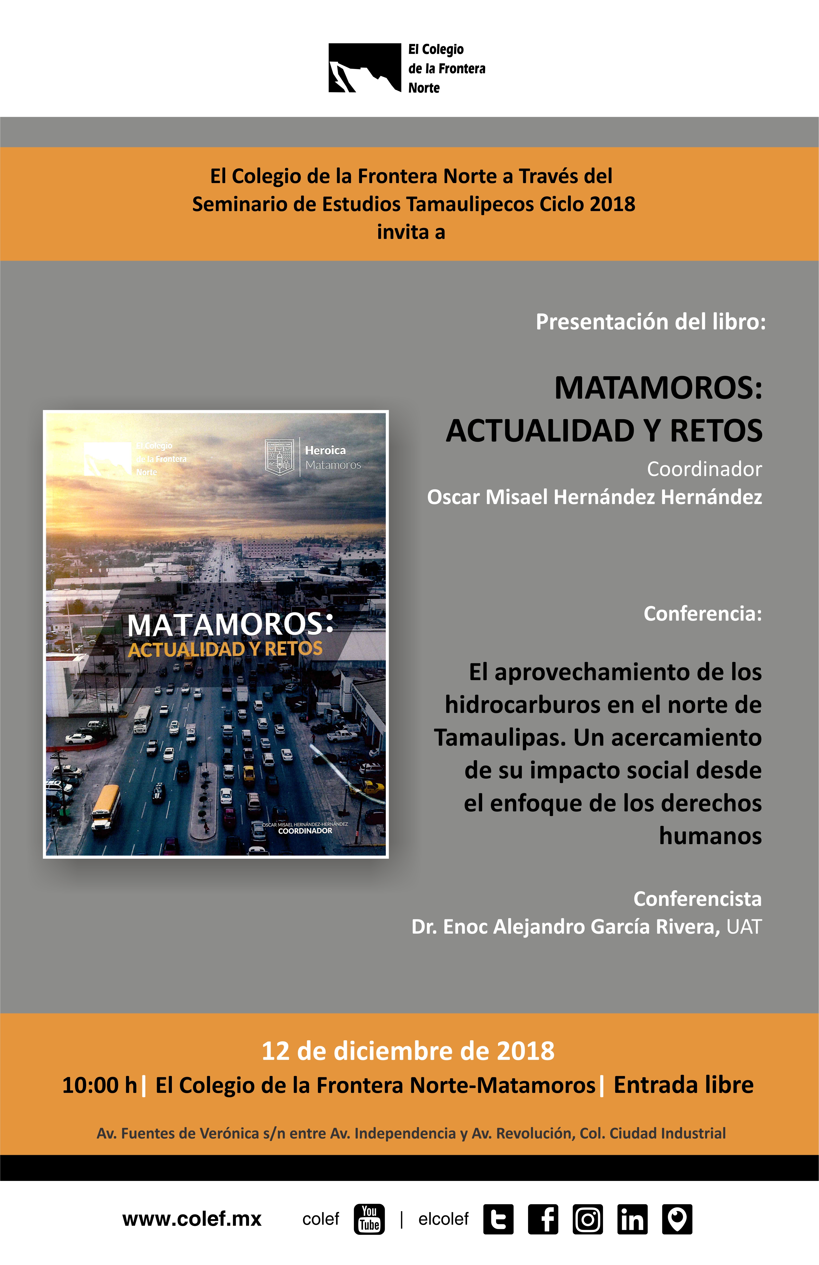 Matamoros: Actualidad y retos, es un libro derivado de un diagnóstico solicitado por el H. Ayuntamiento de Matamoros (administración 2016-2018) a investigadores de El Colegio de la Frontera Norte en Matamoros. La coordinación estuvo a cargo del Dr. Oscar Misael Hernández, con la colaboración de la Dra. Cirila Quintero, el Dr. Xavier Oliveras, el Dr. Arturo Zárate, la Dra. Teresa Cueva y el Dr. Jaime Peña de la Universidad Nacional Autónoma de México. El libro incluye un análisis sobre la dinámica económica en la ciudad, un balance de la planeación urbana, de la seguridad pública, la migración de retorno y en tránsito, la equidad de género y los desafíos del desabasto y distribución de agua en la región.