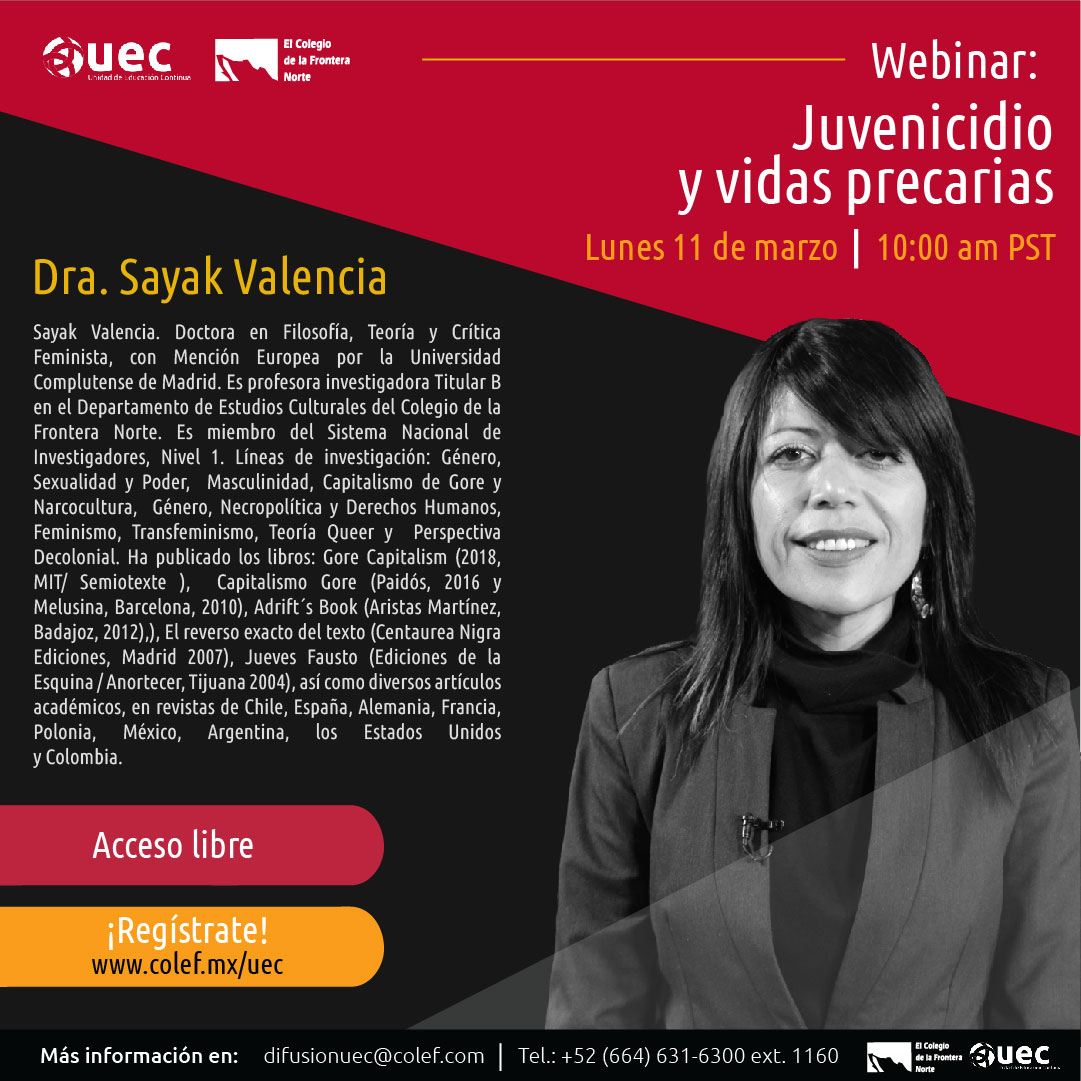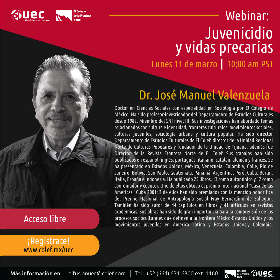 La transmisión contará con la participación del Dr. José Manuel Valenzuela, Investigador del Departamento de Estudios Culturales de El Colef y Coordinador del Diplomado en Línea Juvenicidio, quien abordará el tema de ‘‘Juvenicidio. Un concepto emergente’’. Y con la presencia de la Dra. Sayak Valencia, Profesora-investigadora del Departamento de Estudios Culturales, con el tema de “Feminicidio, necropoder y justicia”.
