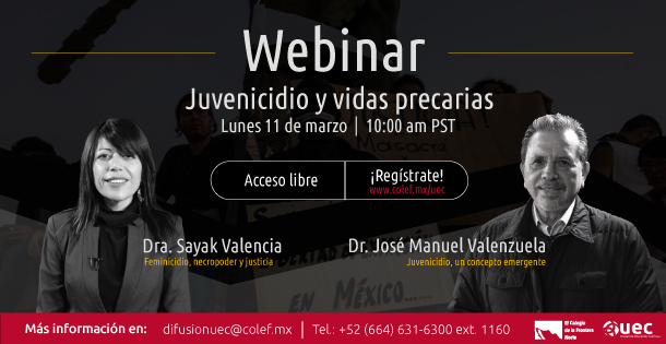 En el marco de la convocatoria del Diplomado en línea “Juvenicidio y vidas precarias en América Latina”, El Colegio de la Frontera Norte (El Colef) a través de la Unidad de Educación Continua, invitan a participar el Webinar (seminario en línea) ‘‘Juvenicidio y vidas precarias’’, el próximo lunes 11 de marzo a partir de las 10:00 am, hora del pacífico.