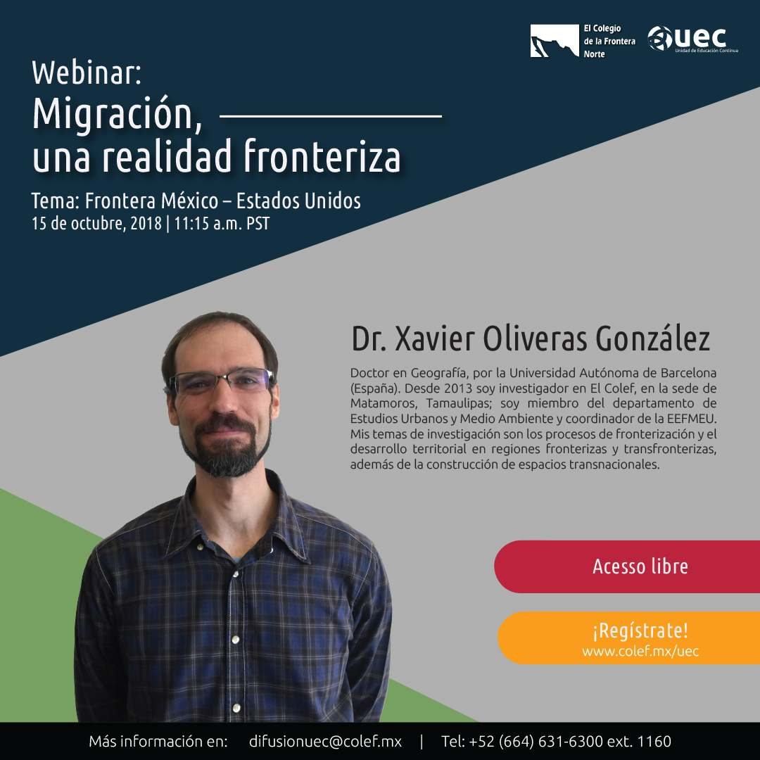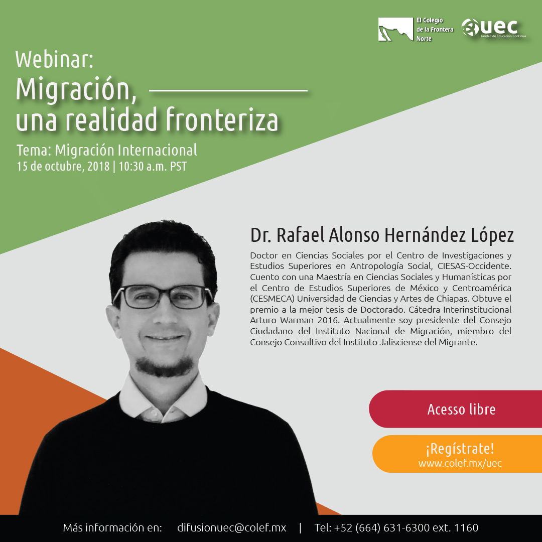 Webinar es una reunión virtual interactiva, de tipo seminario en línea con la participación de académicos expertos en temas de migración internacional y estudios, de la Frontera México Estados Unidos