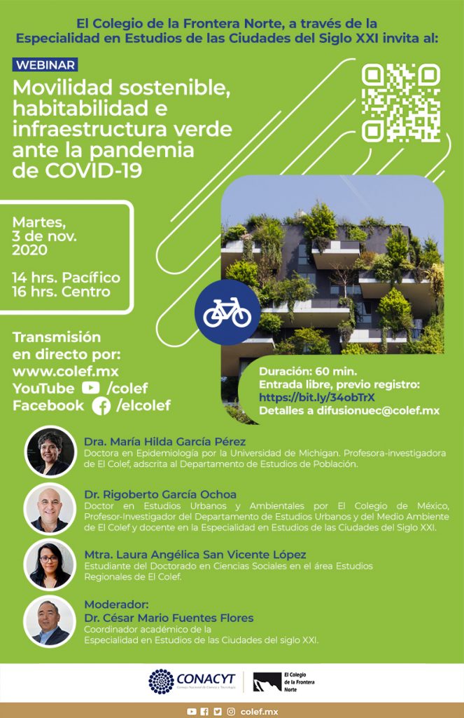 Para más información sobre el Webinar “Movilidad sostenible, habitabilidad e infraestructura verde ante la pandemia de COVID-19”, visite: https://www.colef.mx/evento/84991/